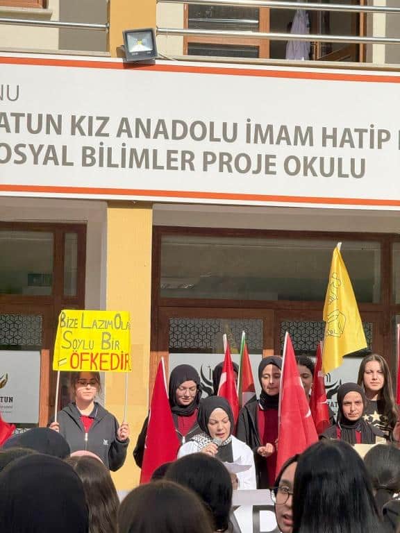 Hüma Hatun Kız Anadolu İmam Hatip Lisesi Fen ve Sosyal Bilimler Proje Okulu olarak, okulumuzda bugün Filistin farkındalık etkinliği düzenlendi. Etkinlik, İsrail’in Gazze’ye yönelik saldırılarına dikkat çekmek, uluslararası hukukun, insan haklarının gözetilmesi çağrısını yüksek sesle dile getirmek amacıyla hazırlandı.